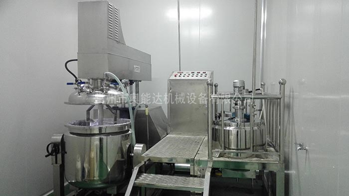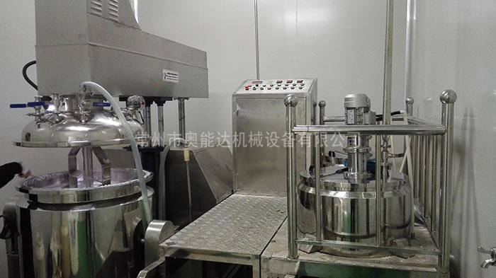 物料在水鍋、油鍋內(nèi)通過(guò)加熱、攪拌進(jìn)行混合反應(yīng)后,由真空泵吸入乳化鍋,通過(guò)乳化鍋內(nèi)上部的中心攪拌、聚四氟乙烯刮板始終迎合攪拌鍋形體,掃凈掛壁粘料,使被刮取的物料不斷產(chǎn)生新界面,再經(jīng)過(guò)葉片的剪斷、壓縮、折疊,使其攪拌、混合而向下流往鍋體下方的均質(zhì)器處,物料再通過(guò)高速旋轉(zhuǎn)的切割輪與固定的切割套之間所產(chǎn)生的強(qiáng)力的剪斷、沖擊、亂流等過(guò)程,物料在剪切縫中被切割,迅速破碎成200um-0.2um的微粒,由于乳化鍋內(nèi)處于真空狀態(tài),物料在攪拌過(guò)程中產(chǎn)生的氣泡被及時(shí)抽走。采用抽真空的方式,使所生產(chǎn)的制品在攪拌過(guò)程中不再混入氣泡,從而保證可制造出富有光澤、細(xì)膩及延展性良好的產(chǎn)品。